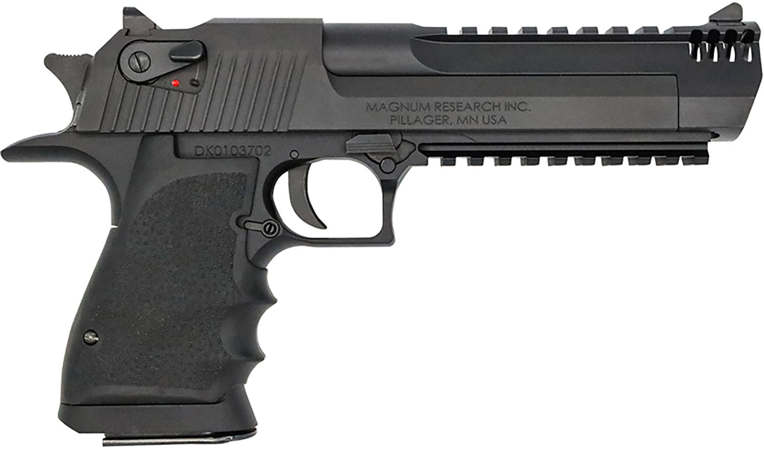 The Magnum Research Desert Eagle .429 DE Pistol is single action and has a 7-round capacity. It's built with a steel barrel and slide, aluminum frame and a wraparound finger groove rubber grip. Fixed combat sights and a picatinny optics rail complete the design.