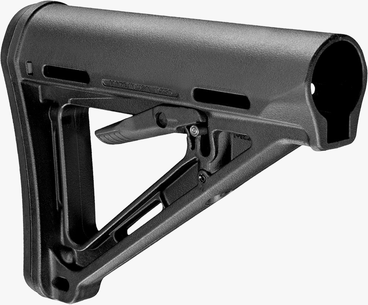 The Magpul MOE Mil-Spec Carbine Stock is a drop-in replacement stock for the standard M4 stock body with an A-frame design that offers enhanced strength and ergonomics. The stock is made of reinforced polymer and features a streamlined, exterior rubber butt pad and a shielded operation lever.