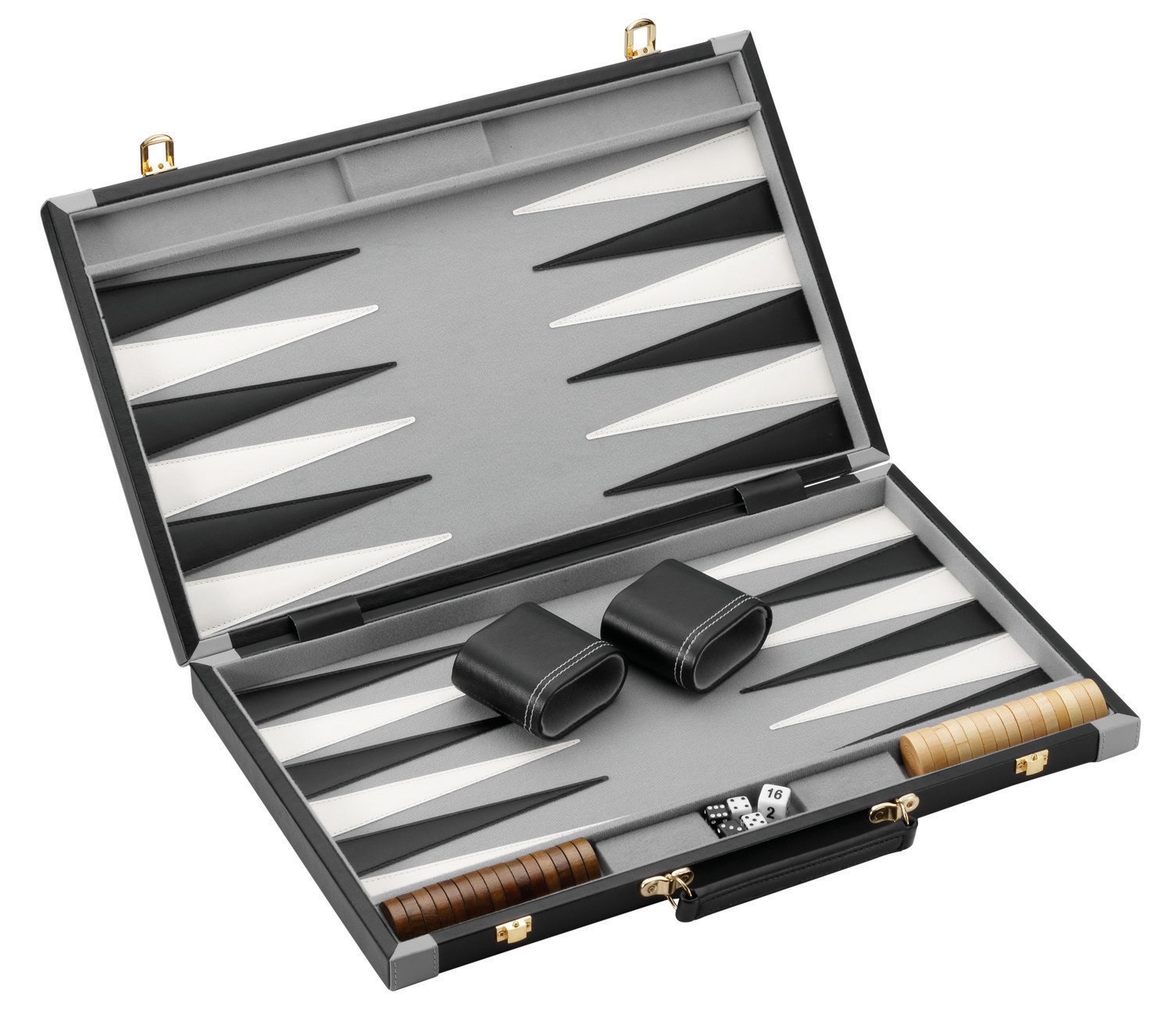 Includes a doubling cube, 2 pairs of dice and 2 leatherette dice cups