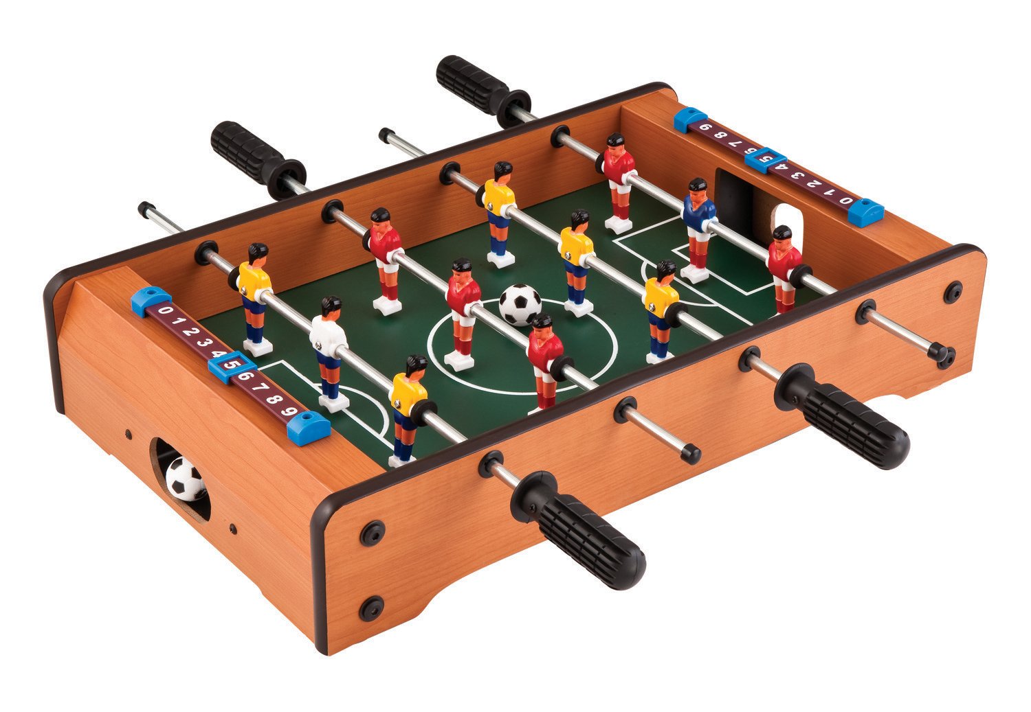 Challenge friends and family to a friendly game with the Mainstreet Classics Sinister Table Top Foosball Table. Constructed with metal player rods and rubber handles, the foosball table features slide scorers for easy goal tracking and a portable design that allows you to play in a variety of locations and offers easy storage. Includes 2 foosballs.
