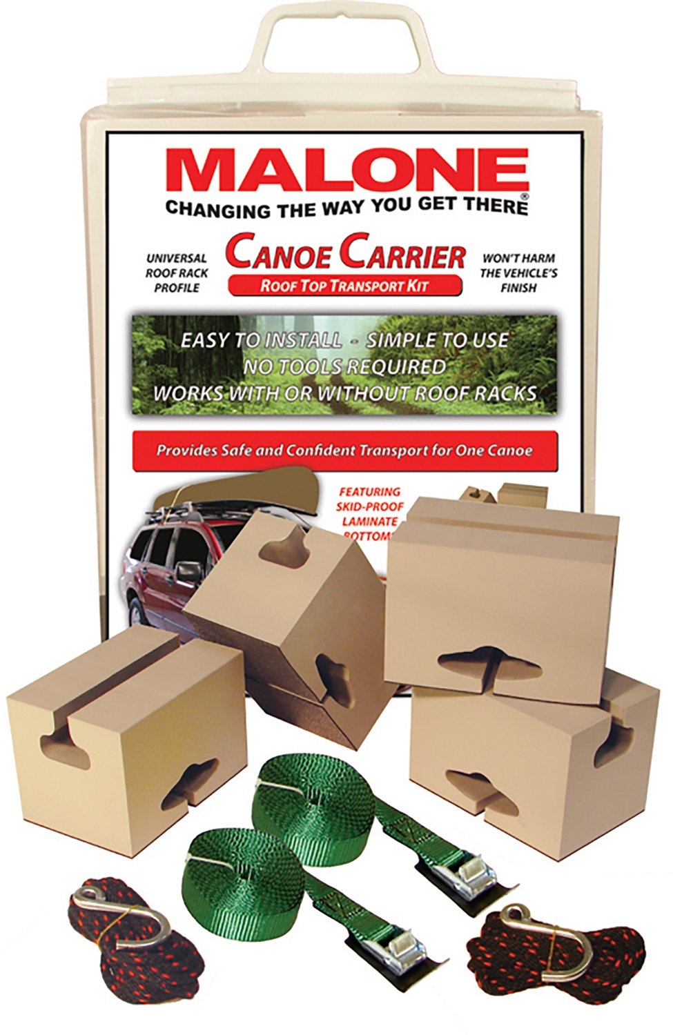 Safely transport your canoe with the Malone Auto Racks Standard Canoe Kit. Its four 6-inch long non-skid EVA foam blocks are a universal fit. The two 15-foot cam buckle load straps secure the canoe, and its 2 safety tie-downs fully ensures a safe installation. The travel tote holds the kit when not in use.