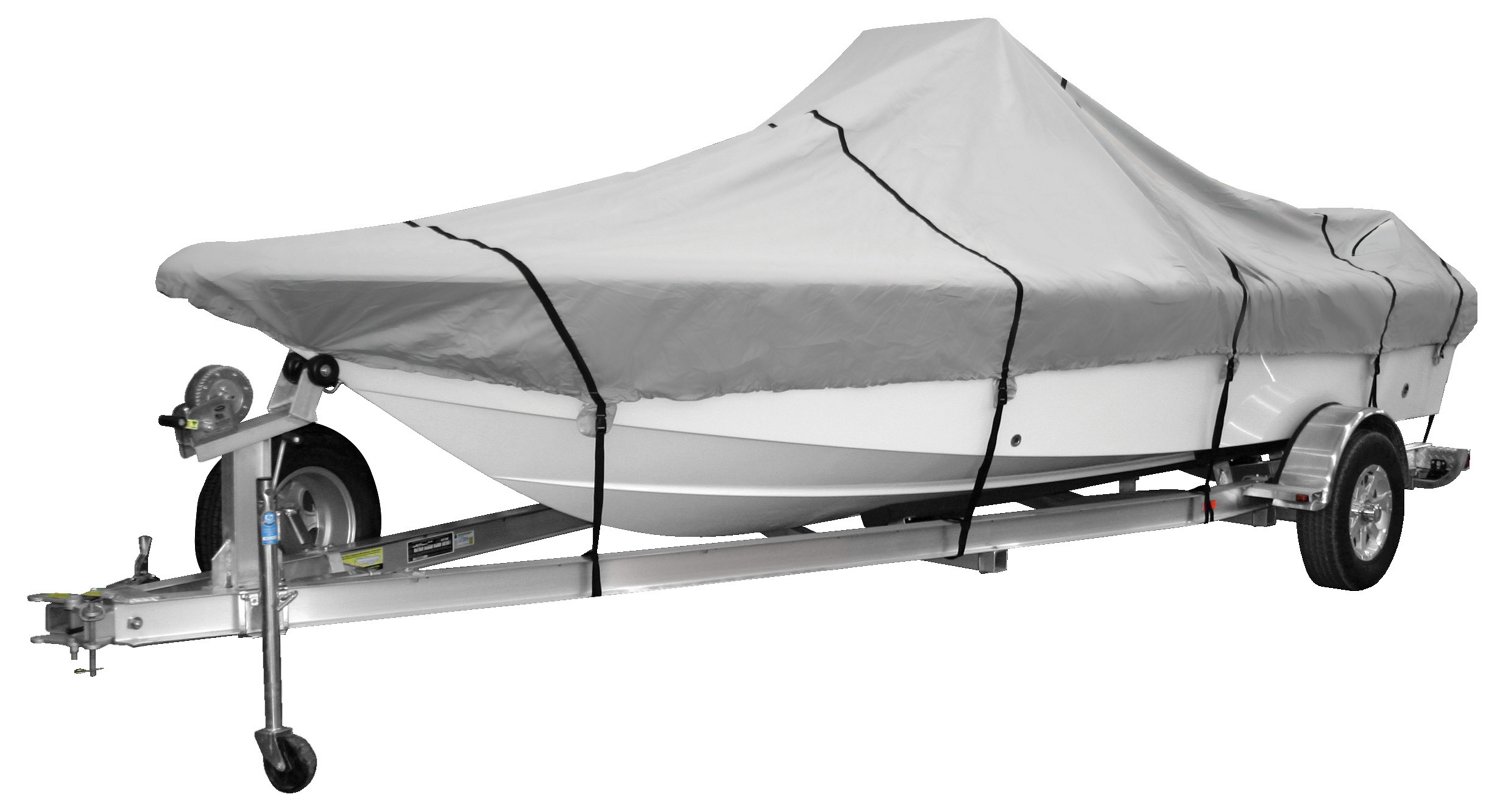 Heavy-duty, 600-denier gray polyester with fabric reinforcements at the bow and stern for strength and durability