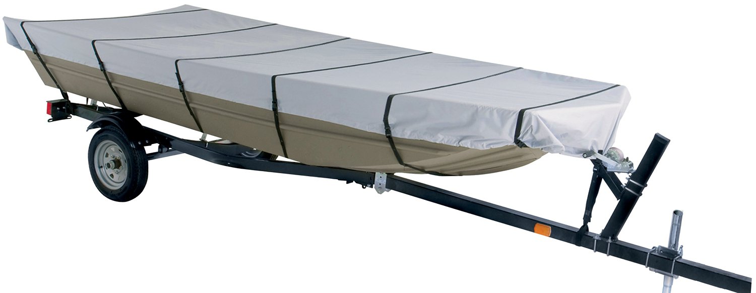 The Marine Raider Model B 300-Denier Boat Cover Fits 14' Jon Boats fits 14' jon boats with a beam width of up to 70". Made from heavy-duty polyester that is treated to repel water and resist UV and mildew, the jon boat cover features fabric reinforcements at the bow and stern to provide added strength and durability.