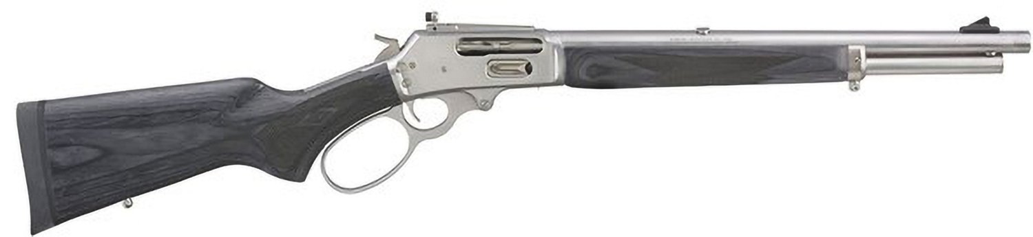 The Marlin Model 1895 Trapper .45-70 Lever Action Rifle is a lever action gun capable of feeding .45 to .70 government calibers. It features a threaded barrel made with cold hammer-forged steel and a textured laminate stock. The lever is made of stainless steel with a cross-bolt manual safety.