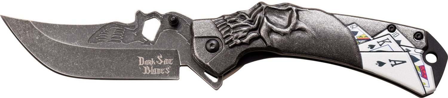 The Master Cutlery Darkside Blades Royal Flush Spring Assisted Pocket Knife features a fine-edge tanto blade and an aluminum handle with embossed printing. A pocket clip is included for easy carrying. 5.6 ounces. 3.5-inch blade length. 8.4-inch overall length.