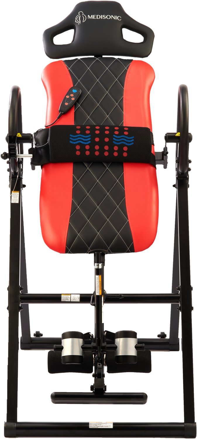Treat your back to the Medisonic Inversion Therapy Table with Heat and Vibration. Its steel, plastic and synthetic leather construction enhances durability, and the adjustable head rest has a heat and massage lumbar pad. The padded handles and foot clips keep you comfortably secure.