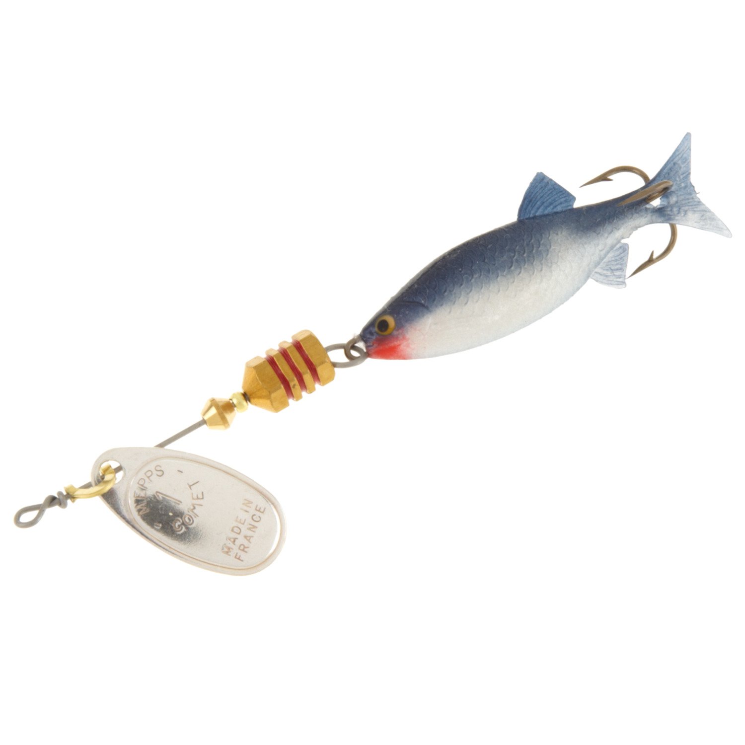 Catch more bass with the Mepps 1/6 oz Comet Mino In-Line Spinner. The treble hook has a 1-7/8" shad Mino that features an erratic swimming action to appear to be a wounded baitfish, and the spinner is airbrushed to ensure a realistic appearance.