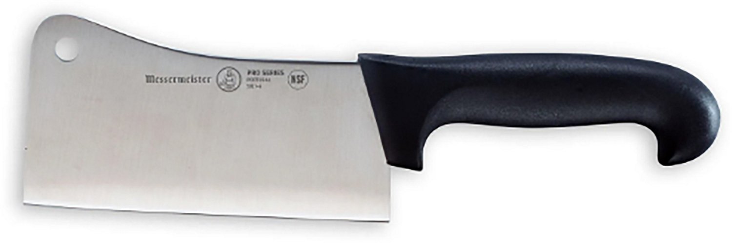 For cutting large pieces of meat, turn to the Messermeister Pro Series 6 in Heavy Meat Cleaver. Its razor sharp edge cuts through whole poultry and bones with ease. The blade is crafted from German stainless carbon alloy and won't stain or corrode, while the oversize, ergonomic handle is comfortable to wield. Easy to resharpen. Hand wash only.