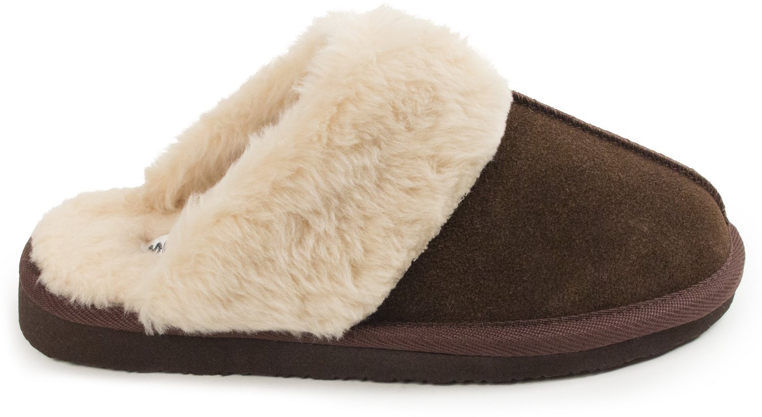 Your feet will stay comfortable in the Minnetonka Women's Chesney Scuff Slippers. These backless plush slippers feature suede uppers with stand-out stitching. Pile fleece delivers day-long cuddly comfort, while thick EVA outsoles provide on-the-go durability.