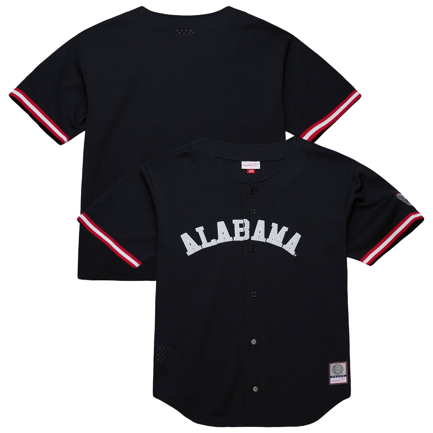 Help your gameday outfit score a style victory with this Alabama Crimson Tide On The Clock fashion jersey from Mitchell Ness It's crafted with a full-body mesh fabric to provide a breathable and comfortable fit that's perfect for all-day wear around the ballpark Plus the full-button front and embroidered fabric appliques add a touch of classic baseball style to this must-have Alabama Crimson Tide jersey