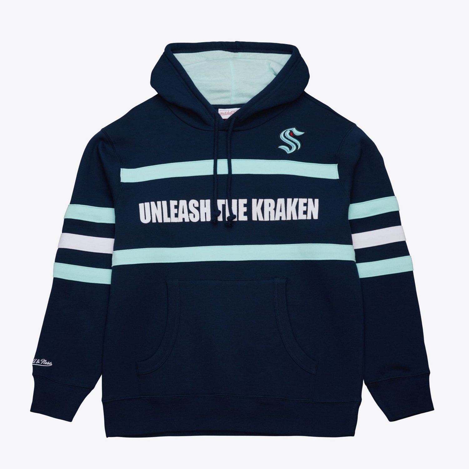 Show your Seattle Kraken pride with this Mitchell Ness Head Coach Slogan Hoodie This pullover is perfect for moderate temperatures keeping you warm and comfortable whether you're at the game or out and about Its embroidered Seattle Kraken graphics and sewn-on stripes add a touch of style while the fleece lining provides an extra layer of warmth