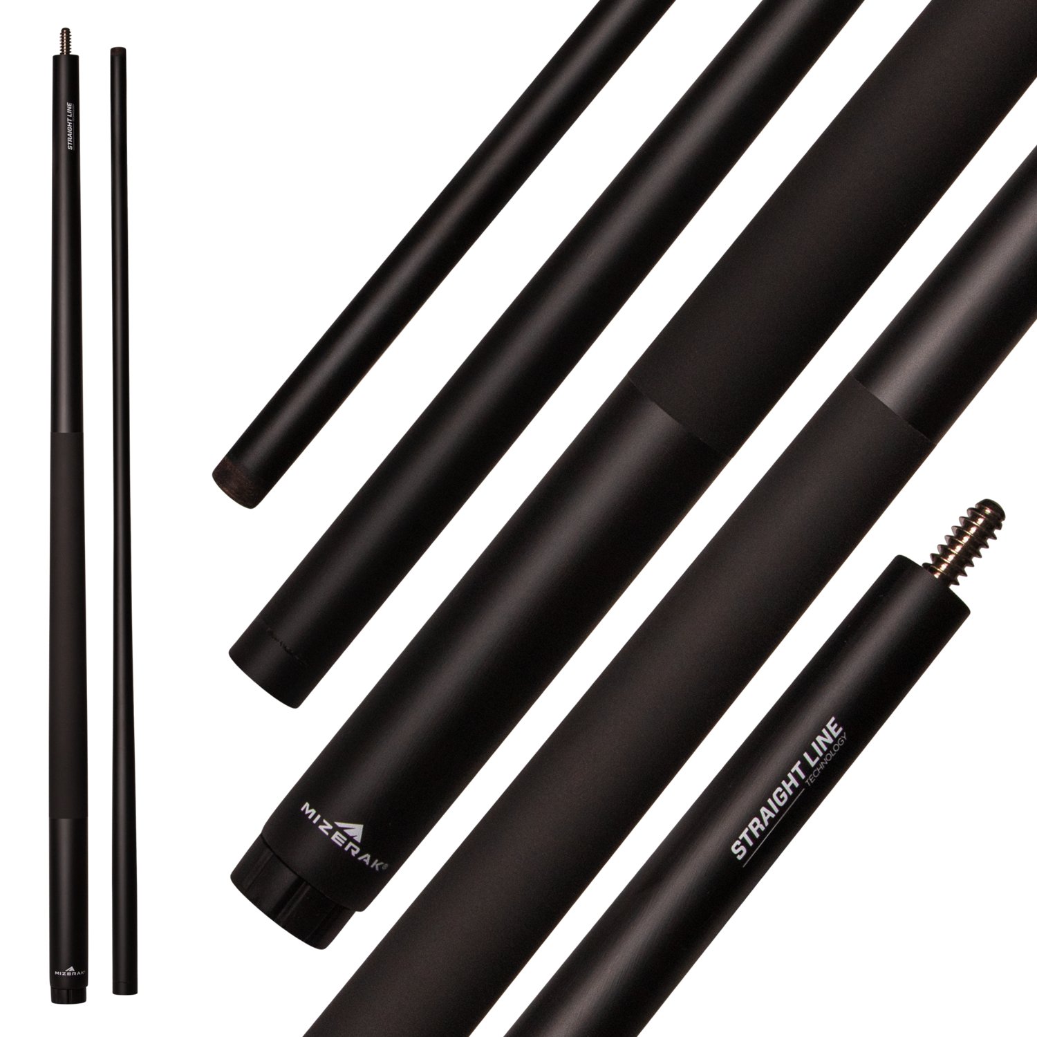 The Mizerak 58" Onyx Two-Piece Composite Cue is designed for high performance and durability, featuring a two-piece composite construction with Straightline Composite Warp Resistant Technology. This cue sports a sleek matte black finish, offering a modern and stylish look. It is equipped with a non-slip MicroTac coated grip, enhancing accuracy and control during play. The cue also includes a 13mm black ferrule with a leather tip for precise shots. A custom rubber bumper is added for extra protection and longevity, making this cue a reliable choice for players seeking both style and functionality.