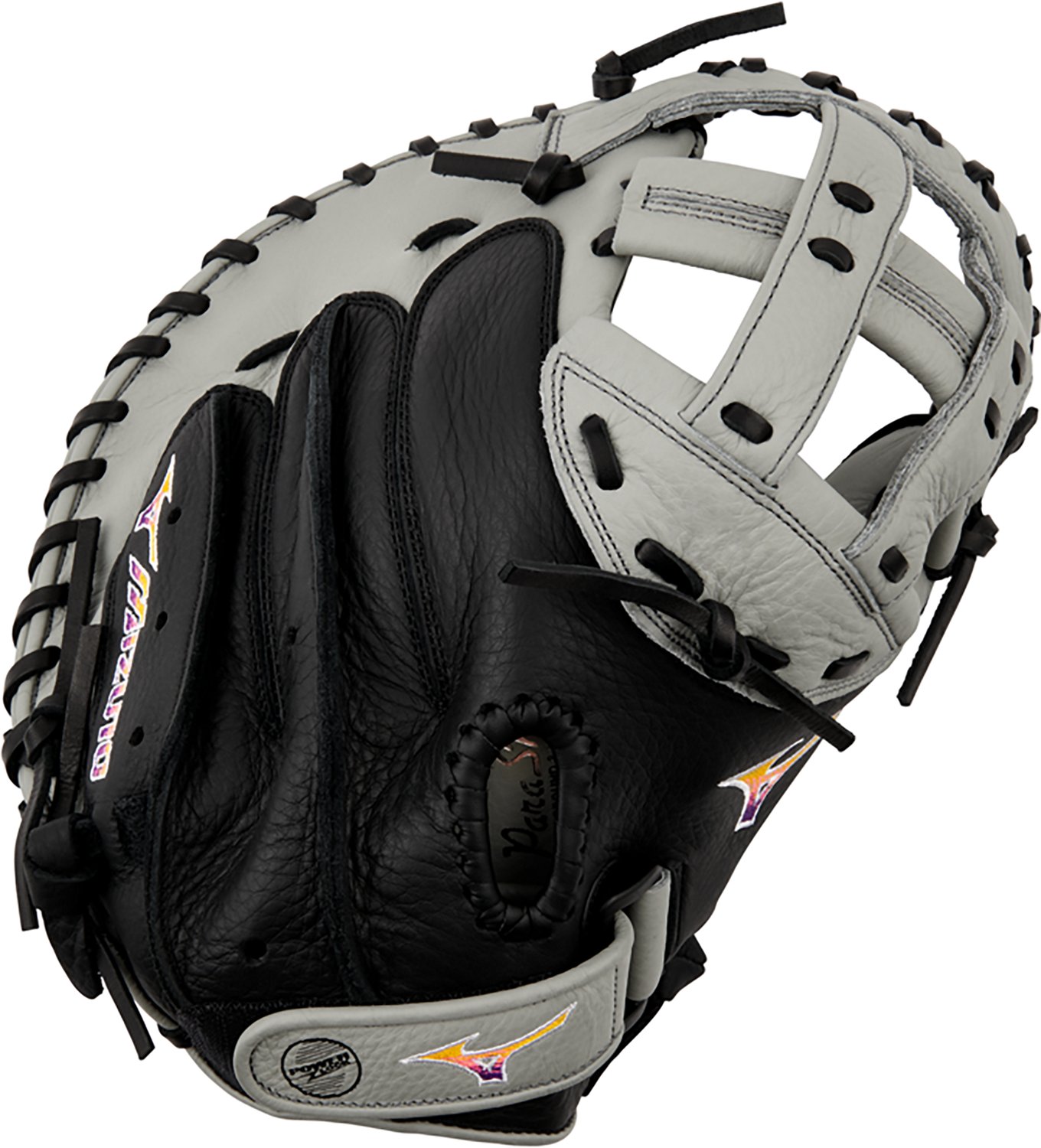 Cover home plate with the Mizuno 34 in Franchise Series Fastpitch Softball Catcher's Mitt. The full grain leather construction offers durability, while the Parashock + Palm Pad absorbs impact for reduced sting. HiLo lacing improves flexibility, and a V-Flex notch ensures easy closure.