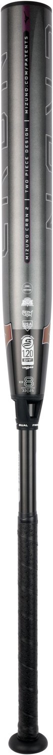 Swing big using the Mizuno CRBN2 Fastpitch Softball Bat -8. This 2-piece Black Onyx Carbon™ bat offers increased durability with a shorter break-in period. The Speed-Helix grip provides increased control.