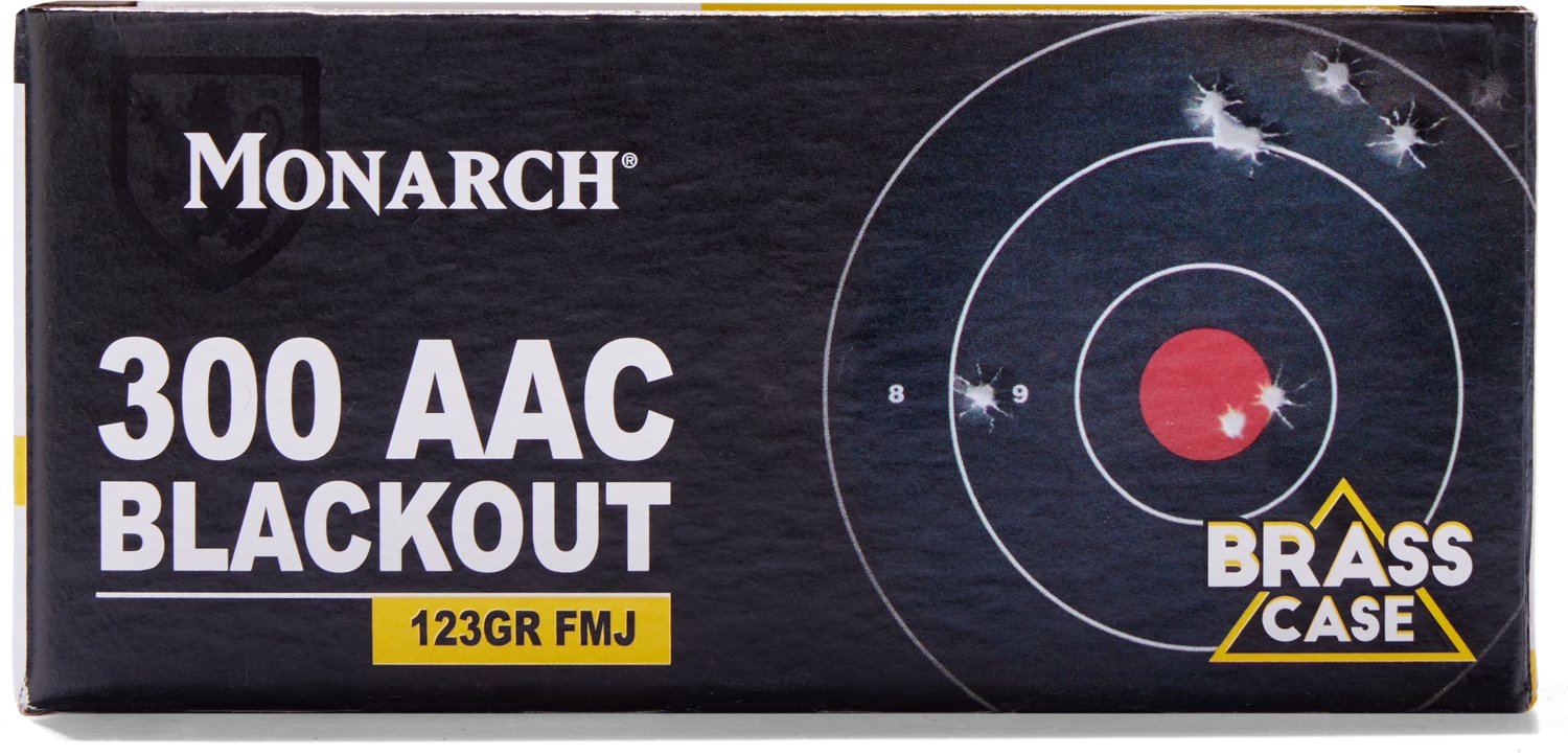 Load up for target practice with the Monarch .300AAC Blackout 123-Grain Ammunition - 50 Rounds. This .300AAC Blackout caliber ammunition weighs 123 grains and comes in a 50-round box.