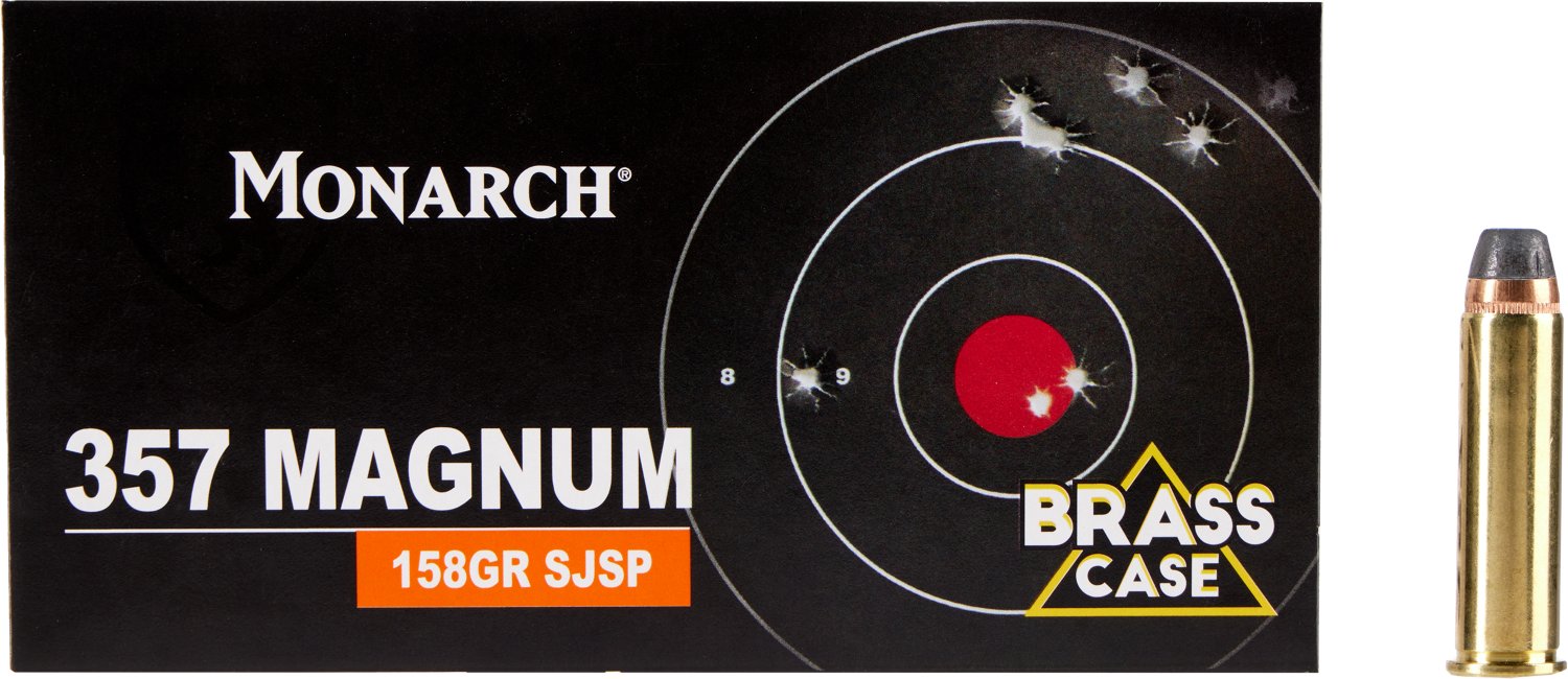 Designed for home defense, the Monarch .357 Magnum 158-Grain Centerfire Pistol Ammunition - 50 Rounds features semi-jacketed soft point bullets and brass cases. 50-round box.
