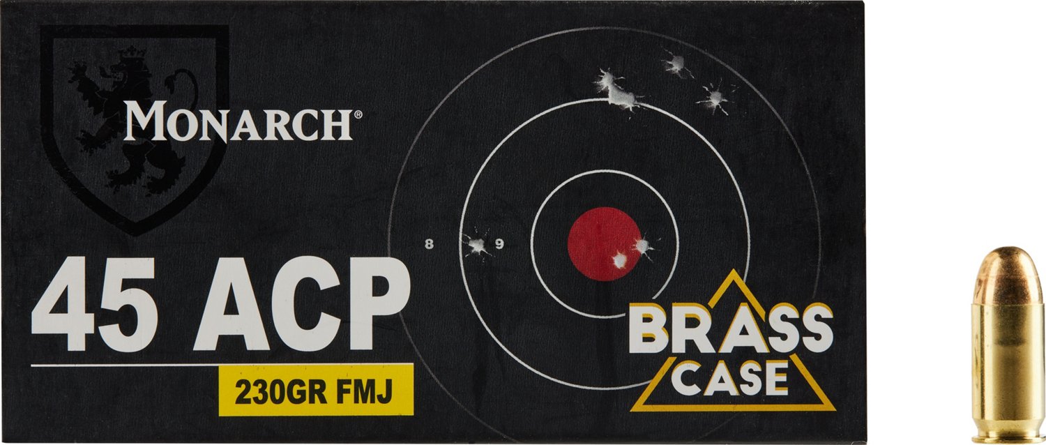Great for target shooting, the Monarch .45 ACP 230-Grain Pistol Brass Ammunition - 50 Rounds features 230-grain rounds with lead cores along with copper jackets and brass cases. 50-round box.