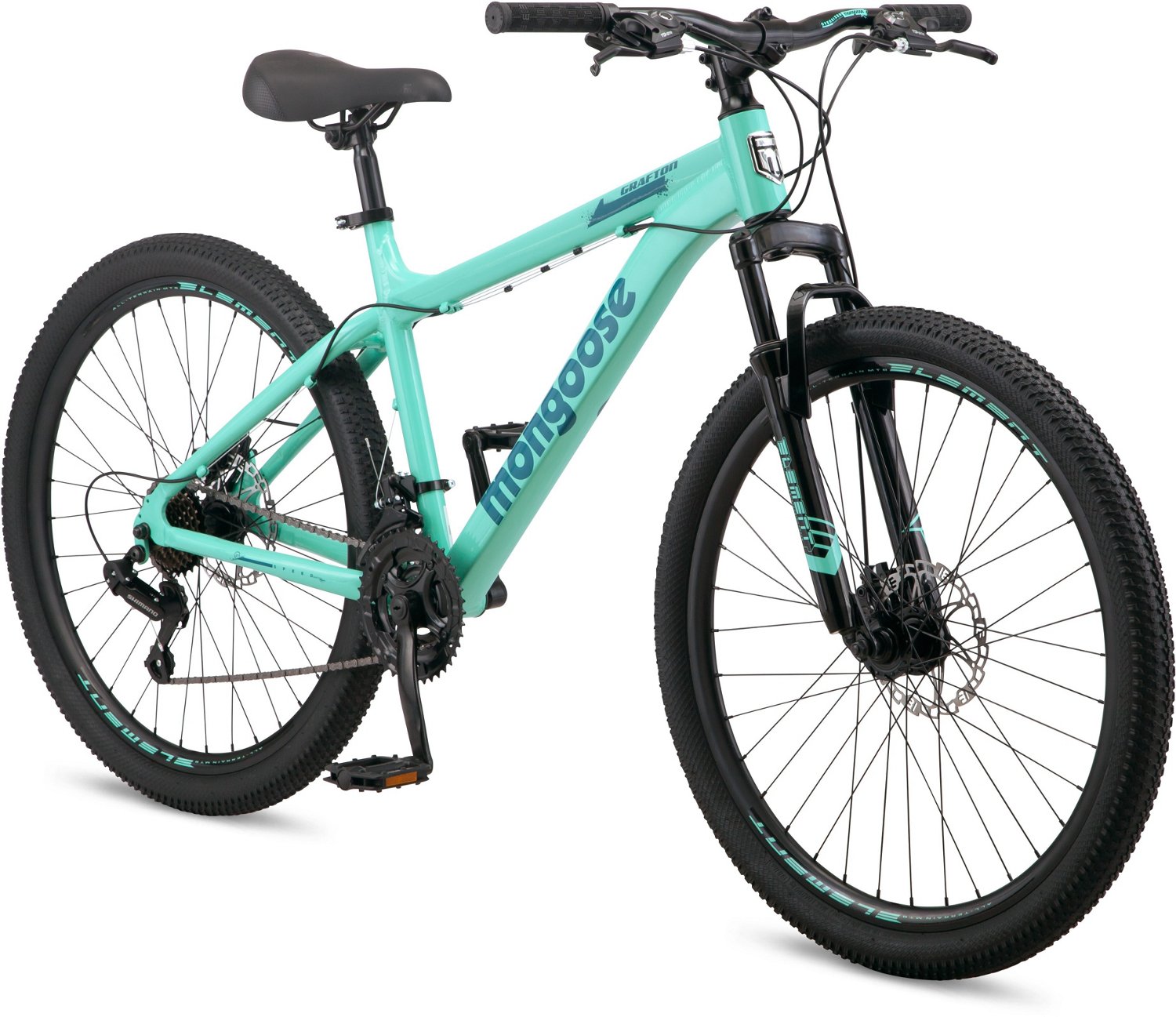 Embark on your next mountain biking adventure with the Mongoose Grafton 26 in Mountain Bike for women. Designed with a durable hardtail aluminum frame, this bike is built to handle various terrains with ease. The front suspension and suspension fork smooth out rough trails, while the 26-inch x 2.3-inch tires with aluminum double-wall rims ensure a stable, smooth ride. Equipped with mechanical disc brakes for reliable stopping power and steel low-rise handlebars for enhanced control, this bike offers both performance and comfort. The 21-speed trigger shifters provide seamless gear changes, and the Mongoose Mountain seat ensures a comfortable ride. Perfect for riders 64 to 74 inches tall.