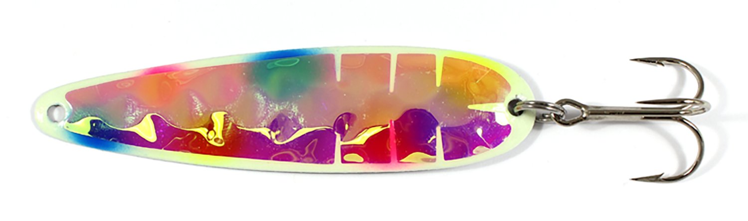 Draw in salmon, trout and more with the Moonshine Lures Standard Trolling Spoon. The spoon glows when exposed to UV light, making it ideal for nighttime fishing as well as daytime fishing.