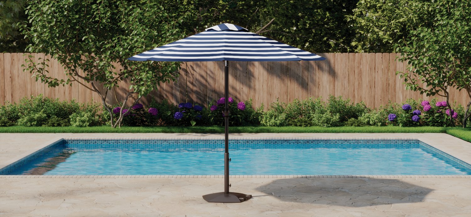 Protect against the sun with the Mosaic Round 9 ft Patio Market Striped Umbrella. The polyester cover and steel pole affords durability, while the UV resistance ensures lasting use. The crank open design allows for easy manipulation, and the closure strap helps keep umbrella secure