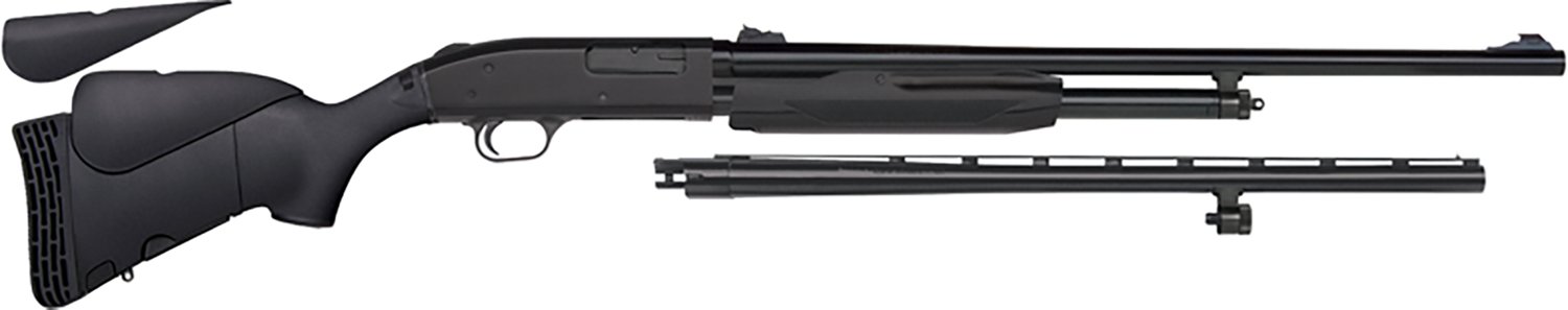 The Mossberg 500 Bantam Field/Deer Pump Action Shotgun is pump action and has a 5-round capacity. It's built with a vent rib barrel, 4-position flex synthetic stock and an EZ-Reach fore-end. Adjustable rifle sights and a tang safety complete the design.