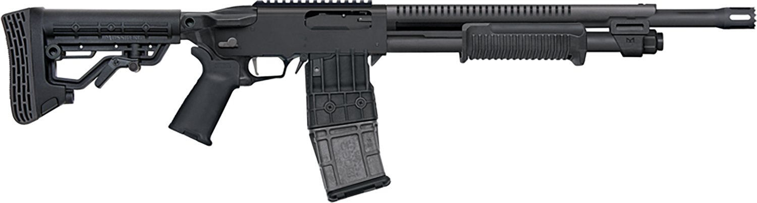 Designed for recreational use, this Mossberg 590RM 12-Gauge Pump-Action Shotgun features an 18.5-inch breacher barrel with a matte blued finish atop a synthetic stock with AR furniture. Its aluminum receiver is aircraft-grade, and it has a flat-profile trigger, an M-Lok adapter, a single-piece heat shield and a cylinder bore choke. Comes with one 10-round magazine.