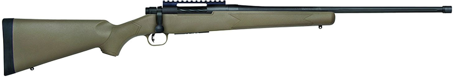 The Mossberg Patriot Synthetic .243 Winchester Bolt-Action Rifle features a fluted barrel and a steel receiver on a synthetic stock. The gun's barrel is equipped with a threaded muzzle, and its metal surfaces feature a blued finish. This rifle also features an adjustable LBA trigger. 2-position safety.