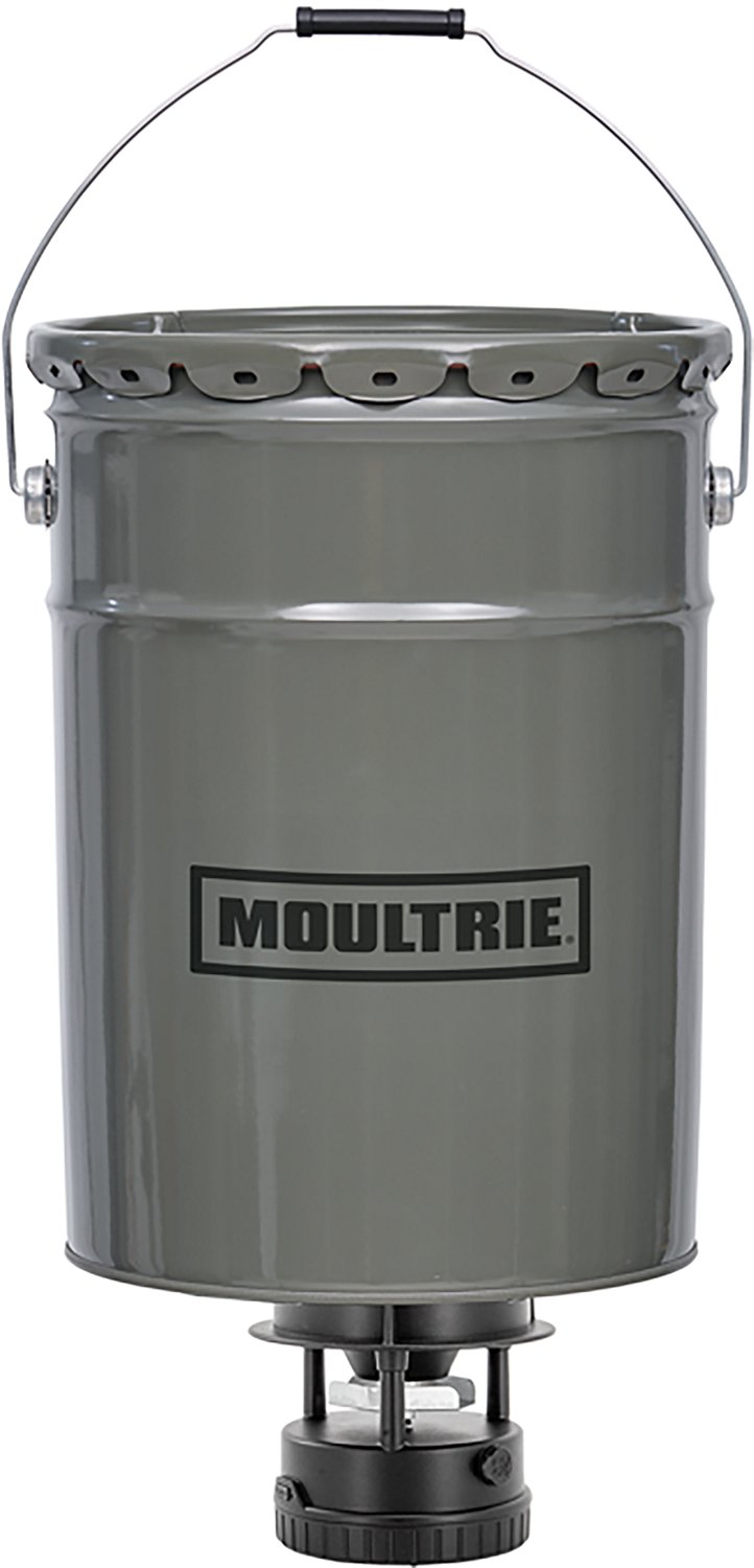Feed your wild neighbors with the Moultrie 40 lb. Hanging Directional Feeder. It is perfect for areas with uneven ground or hard-to-reach spots, or for supplemental feeding. The durable metal hopper and lid keeps feed secure and protected from the elements, and its corrosion-resistant metal bucket and lid protects feed from varmints and weather. The feeder can be set up to 4 feed times per day, from 1-60 seconds.
