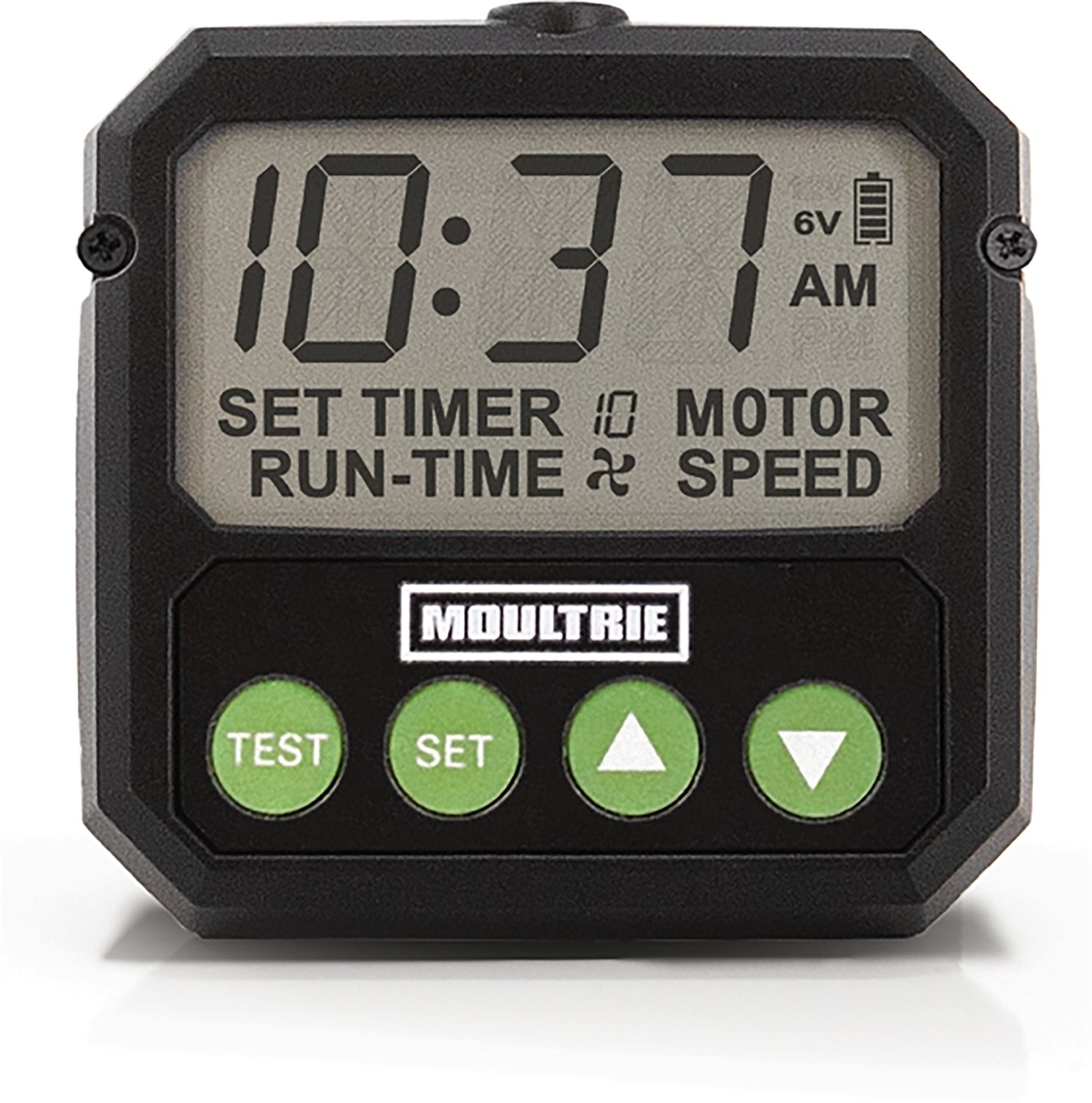 Schedule feed times with the Moultrie Universal Digital Timer lll. It can connect via Bluetooth using the Moultrie App to adjust settings without disturbing your setup. The ability to sync feed times with the sunrise and sunset, create custom schedules for different days, check estimated feed levels, and run the feeder on demand does not require a subscription, and it sets up to 10 feed times per day, from 1-60 seconds. The timer is designed to work with both 6V and 12V feeders.