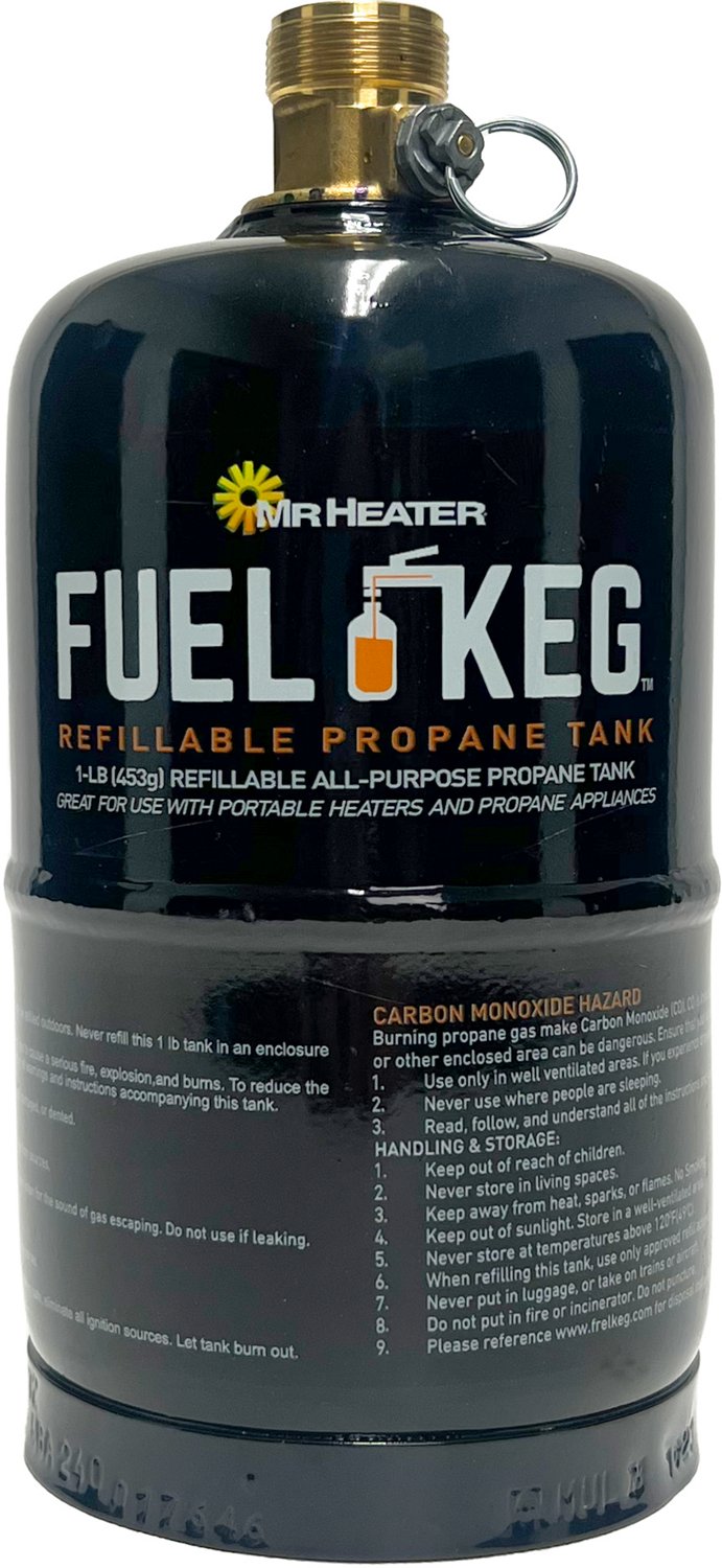 Reduce waste while fueling camping stoves with the Mr. Heater Refillable Propane Fuel Keg. This steel tank is durable and rust-resistant for multiple uses. The refillable design reduces waste and prevents fuel tanks from going to the dump, while the overflow protection valve stops propane from leaking out when filling. This tank is designed for use exclusively with Mr. Heater Fuel Keg propane tank refill kits.