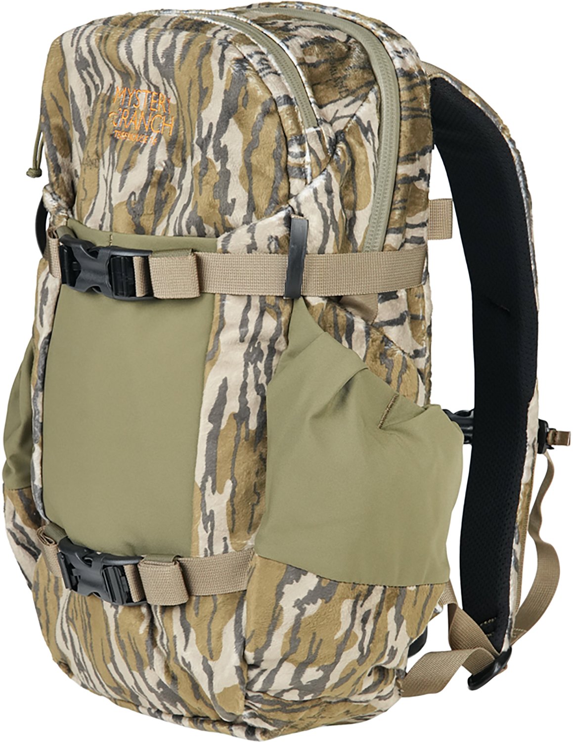 Venture into the woods with the Mystery Ranch Treehouse 16 Camo Hunting Backpack. The nylon 210D and 640 cotna fabric affords durability and helps keep you quiet, while the large main compartment offers ample storage space. The clam shell opening allows for easy access, and the dual compression straps on the face fit a bow, climbing sticks or rattling antlers.