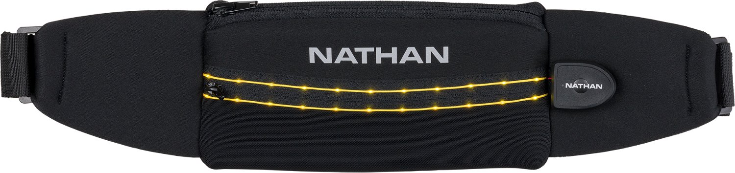 Be seen in low visibility with the Nathan Laser Light 5K LED Belt. Its 8 lumens of integrated LED thread with a reflective logo on the front pocket provides enhanced visibility. The 3 modes offer an average of 3 hours of burn time, and its large zipper pocket with a phone divider allows you to carry larger sized phones. The belt requires 1.5 hours of charge time before use.