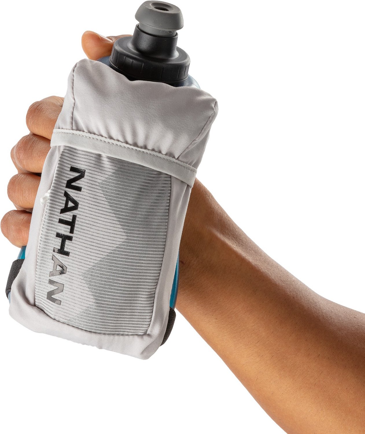 Stay hydrated during your run with the Nathan Quick Squeeze 12 oz Water Bottle. It is designed to fit right in your hand while being easy to squeeze, and it has a no-sweat grip insert that allows for grip-free running.