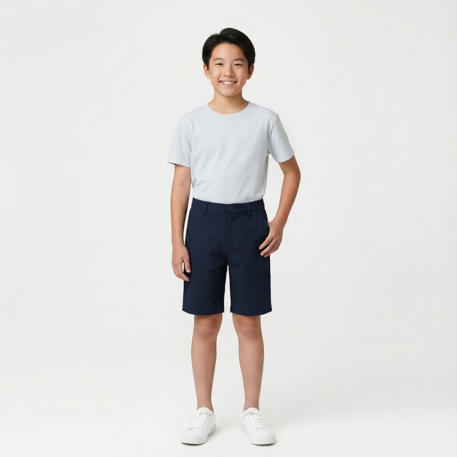 Features and Benefits 100% polyester fabric lends everyday durability Zipper fly with button closure Flat front with belt loops Side and back pockets Machine wash cold; tumble dry low Specifications Compression: No Clothing Type: School Uniforms Ventilated: No Shorts Length: Short Activity: School Material: Polyester Gender: Boys' Size Range: Boys' (8 - 20) Moisture Wicking: No Water Resistant: No Product Type: Shorts Flame Resistant: No Age Group: Kids' Style: Chino Shorts Lining: No What's in the Box Nautica Boys' Flat Front Performance Shorts