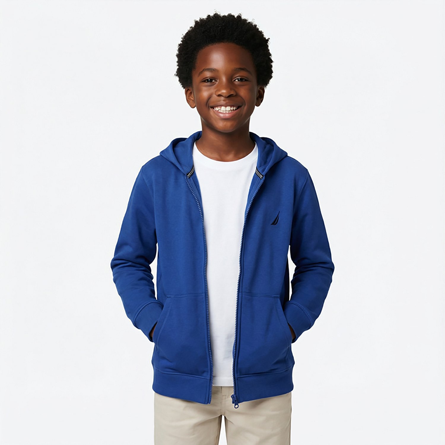 Layer up for a chilly school day with the Nautica Boys' Full Zip Fleece Hoodie. The cotton and polyester material provides a comfortable feel, while the hood offers coverage. The small logo on the front delivers a stylish look.