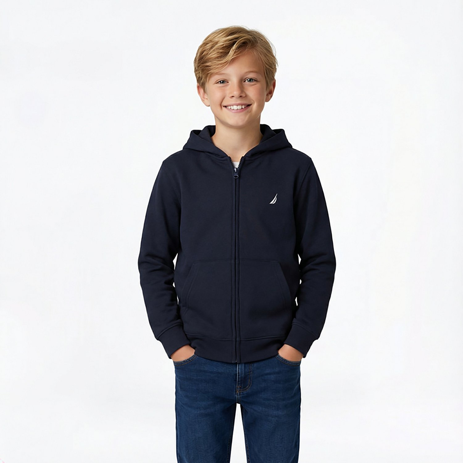 Layer up for a chilly school day with the Nautica Boys' Full Zip Fleece Hoodie. The cotton and polyester material provides a comfortable feel, while the hood offers coverage. The small logo on the front delivers a stylish look.