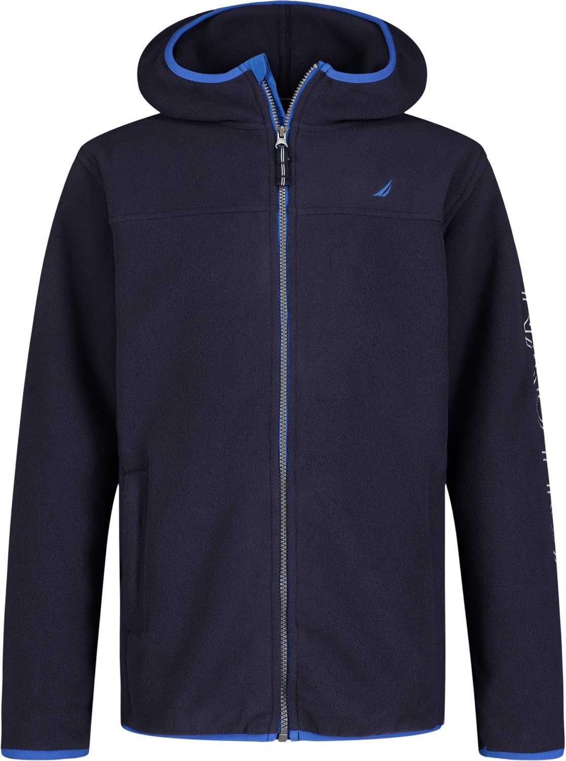 Layer up for a cool day with the Nautica Boys' Hooded Logo Fleece Full Zip Jacket. The polyester material provides a comfortable feel, while the soft inner layer offers warmth. The ribbed cuffs and hemline help keep the cold out, and the logo on the sleeve delivers a stylish look.