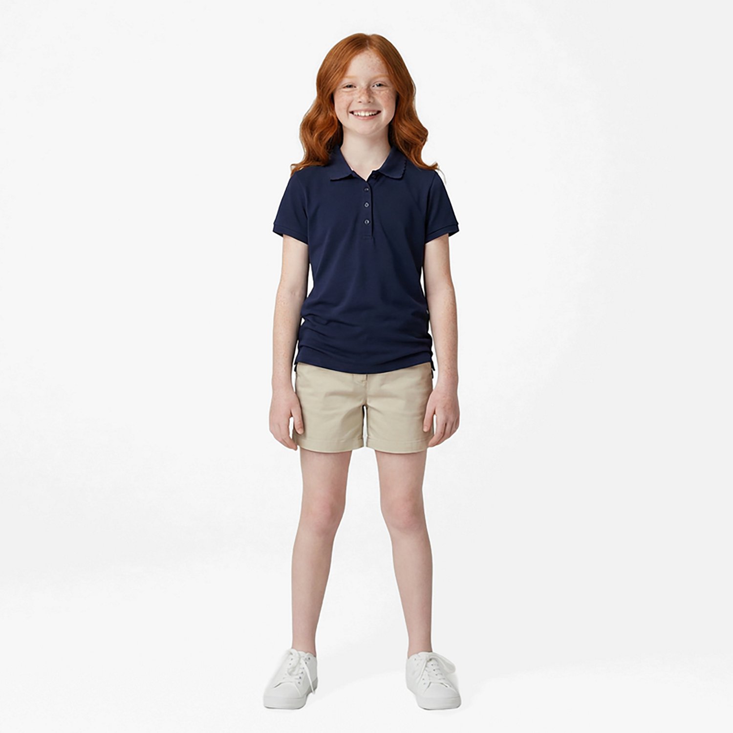 Slip into the Nautica Girls' Plus Interlock Polo Shirt and take on your school day. A cotton/polyester construction ensures comfort, while the side slits flex and move with your body. A 4-button placket and rubbed collar highlight your style.