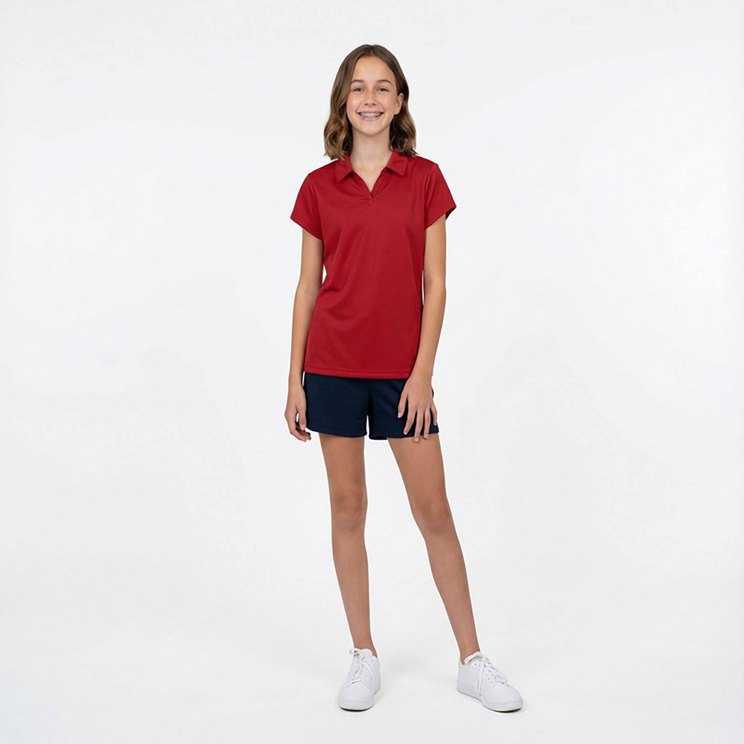 Look good while you stay comfortable in the Nautica Girls' Plus Performance Knit Polo Shirt. The moisture-wicking technology gets rid of moisture to keep you cool and dry, and the 100% polyester construction delivers comfort. A curved hem helps you stay covered, and this top resists wrinkling, shrinking and color fading to remain resilient throughout the school year.