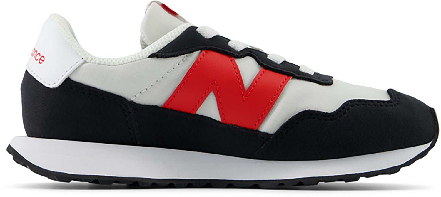 Take on the world in the New Balance Kids' 237 Bungee Shoes. Its upper is constructed from man-made materials that enhance durability. The EVA midsole has an extended length, and its herringbone outsole creates a sharp, deep zigzag pattern. The oversized N branding adds a touch of style.