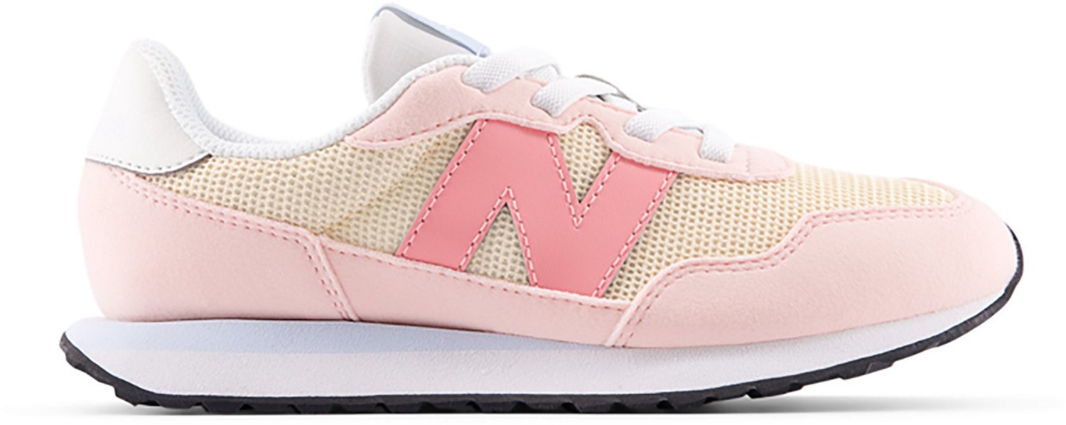Take on the world in the New Balance Kids' 237 Bungee Shoes. Its upper is constructed from man-made materials that enhance durability. The EVA midsole has an extended length, and its herringbone outsole creates a sharp, deep zigzag pattern. The oversized N branding adds a touch of style.