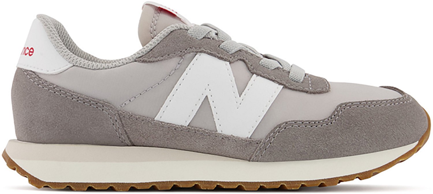 Take on the world in the New Balance Kids' 237 Bungee Shoes. Its upper is constructed from man-made materials that enhance durability. The EVA midsole has an extended length, and its herringbone outsole creates a sharp, deep zigzag pattern. The oversized N branding adds a touch of style.