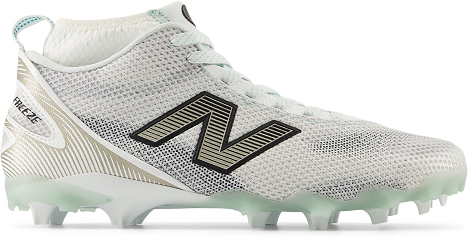 Improve your agility on the field with the New Balance Men's FreezeLX v5 Lacrosse Cleats. The synthetic and mesh uppers provide breathability, durability and stability, while TPU molded cleat outsoles offer traction on turf and natural surfaces. QUIX Rail technology enables quick, lateral cutting movements and external heel counters deliver a locked-in fit.