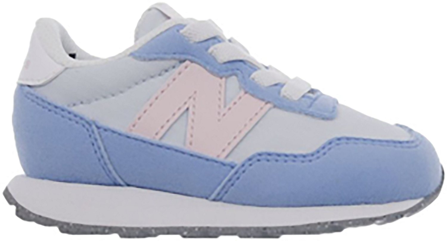 Take on the world in the New Balance Toddler 237 Bungee Shoes. Its upper is constructed from man-made materials that enhance durability. The EVA midsole has an extended length, and its herringbone outsole creates a sharp, deep zigzag pattern. The oversized N branding adds a touch of style.
