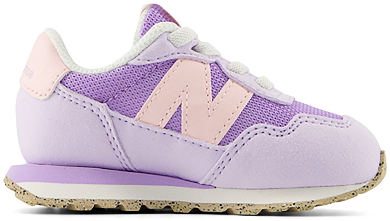 Take on the world in the New Balance Toddler 237 Bungee Shoes. Its upper is constructed from man-made materials that enhance durability. The EVA midsole has an extended length, and its herringbone outsole creates a sharp, deep zigzag pattern. The oversized N branding adds a touch of style.