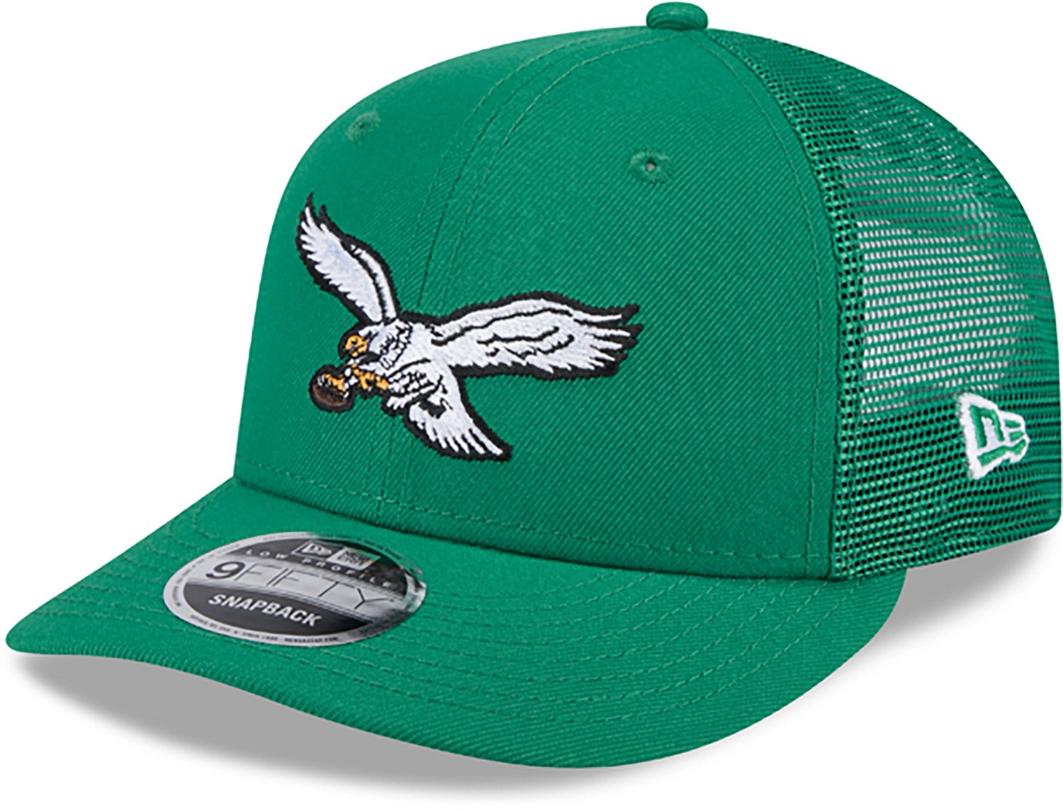Root for your favorite team when you wear the New Era Adults' Philadelphia Eagles Logo Low Profile OTC Trucker Cap. It is made of 100% polyester. The structured crown with a split construction creates a tri-panel shape, and its traditional visor can be flat or pre-curved. The Philadelphia Eagles logo on the front panel shows off your team spirit.