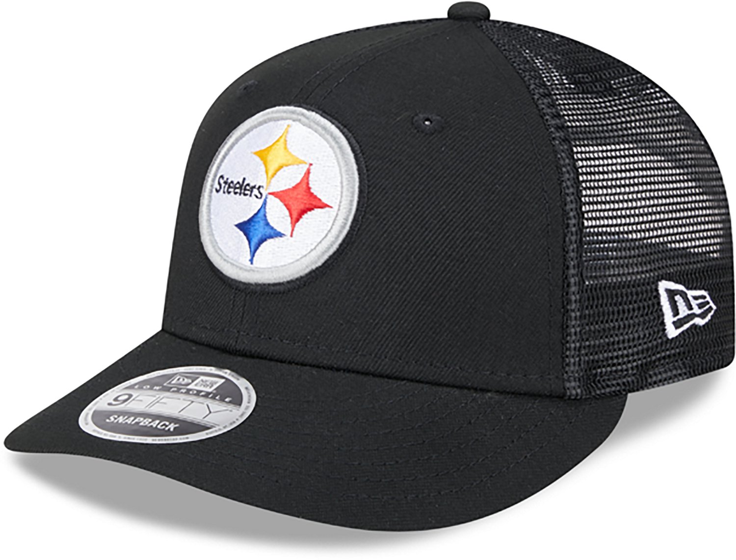Root for your favorite team when you wear the New Era Adults' Pittsburgh Steelers Logo Low Profile OTC Trucker Cap. It is made of 100% polyester. The structured crown with a split construction creates a tri-panel shape, and its traditional visor can be flat or pre-curved. The Pittsburgh Steelers logo on the front panel shows off your team spirit.