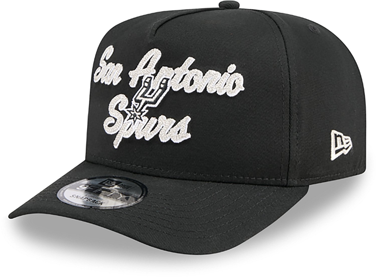 Show off your team spirit wearing the New Era Adults' San Antonio Spurs 9FIFTY Chainstitch Cap. It is made of 100% cotton. It has a classic snapback style, and is designed with an open back with a snap or strap closure. The San Antonio Spurs logo is on the front.