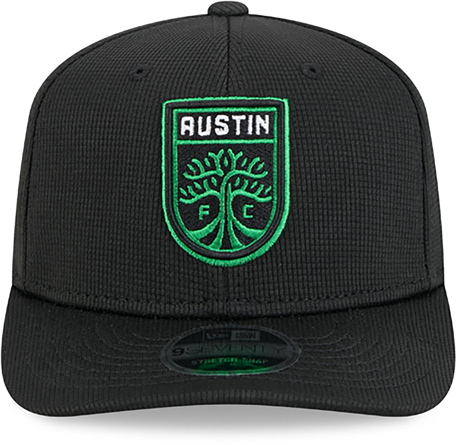 Root for your favorite club while covering your head with the New Era Austin FC Adults' Jersey Hook 9SEVENTY Stretch Snap Cap. The right-wear side patch makes the cap stand out, and the embroidered rear wordmark is a sign of your loyalty to your team. The 9SEVENTY Stretch material is built for relaxed wearing, and the front panels reinforce the fabric.