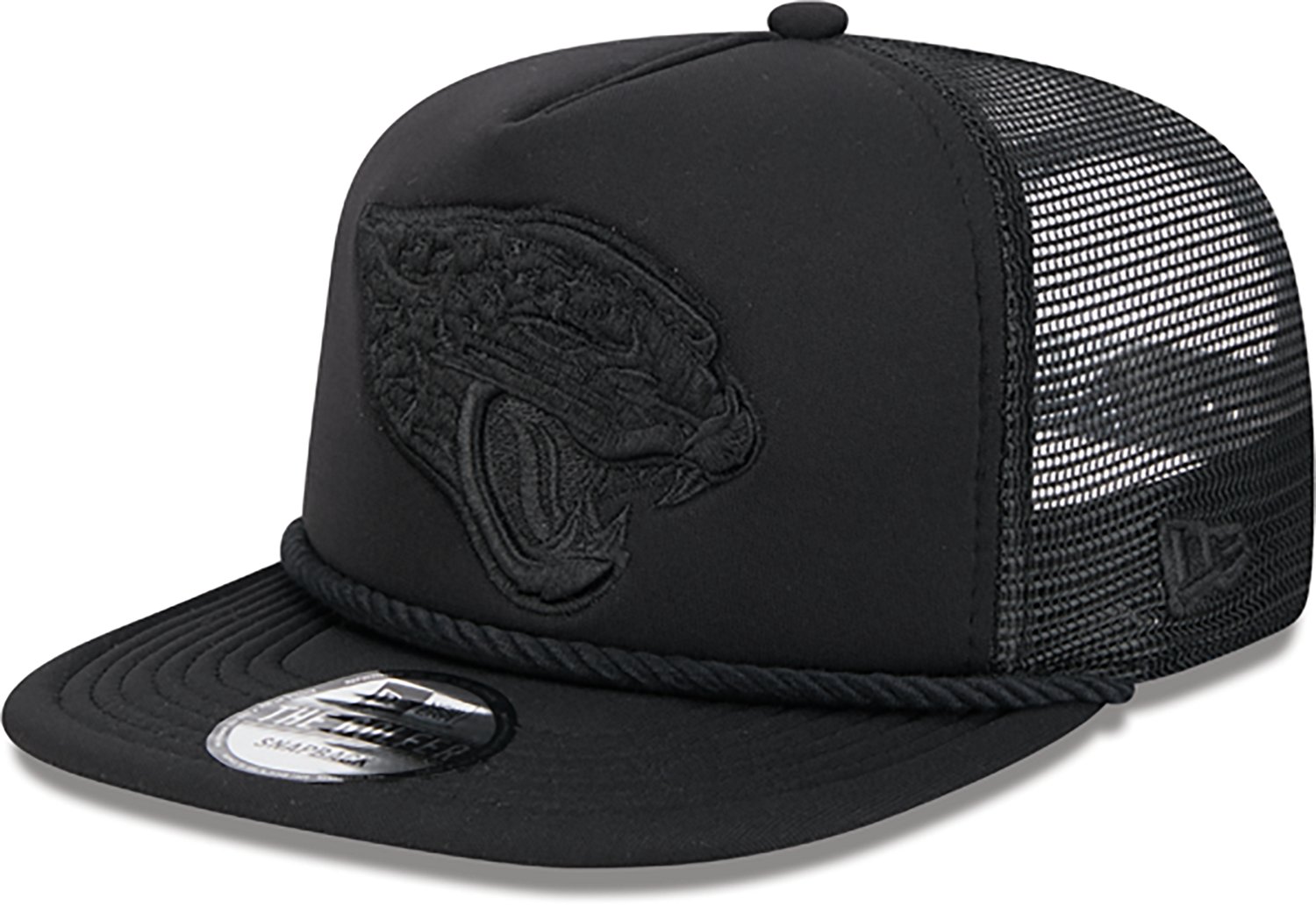 The New Era Golfer Trucker Black on Black Jaguars Cap features an adjustable design for a custom fit. The structured insert lends the style of a fitted cap while the flat visor brings the modern look.